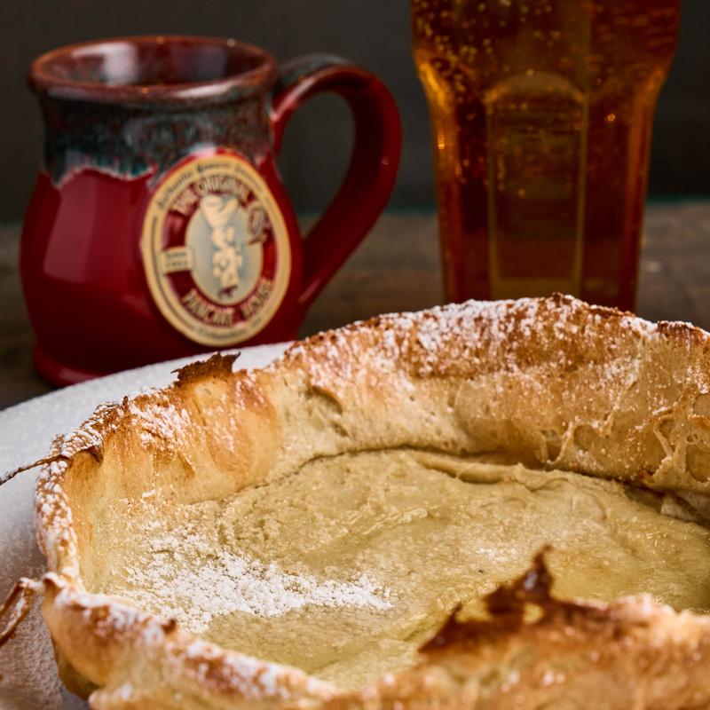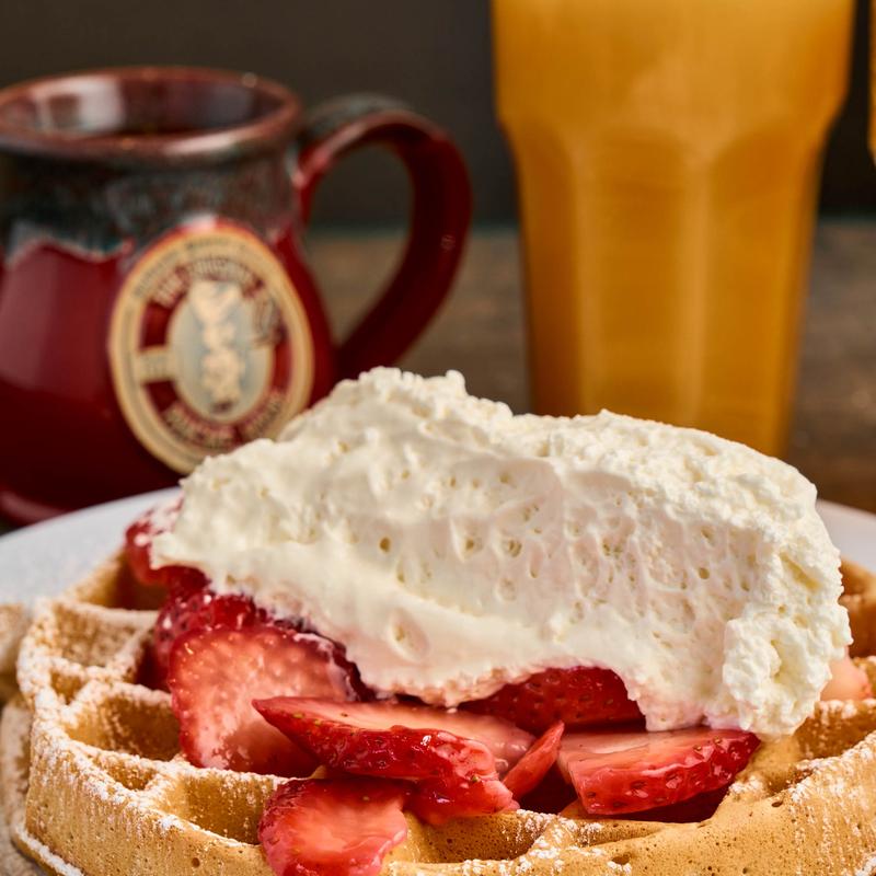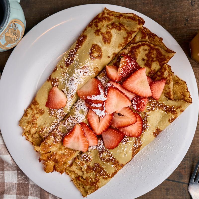 All pancake batters are made from scratch. Homemade strawberry, blueberry, apple, or tropical syrups are available upon request. Gluten-friendly pancakes are available upon request. Ask server for details, add + 2.00 | Fresh fruit or berries with whipped cream + 3.95 | Toasted pecans or almonds add +2.00 | Side of whipped cream + 2.25.