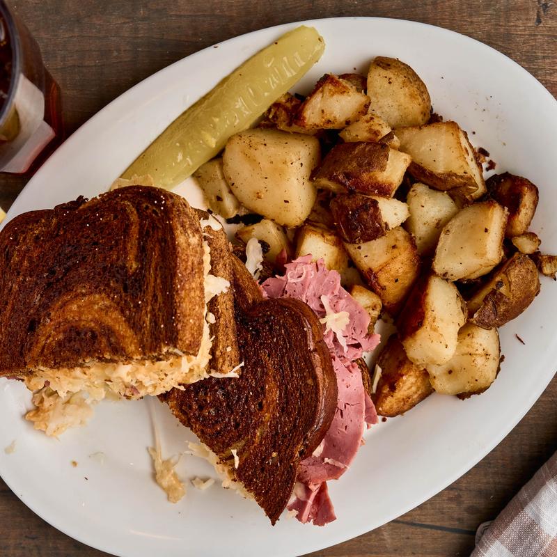 Sliced corned beef on rye with melted Swiss, sauerkraut and 1000 Island Dressing | 1170 CAL