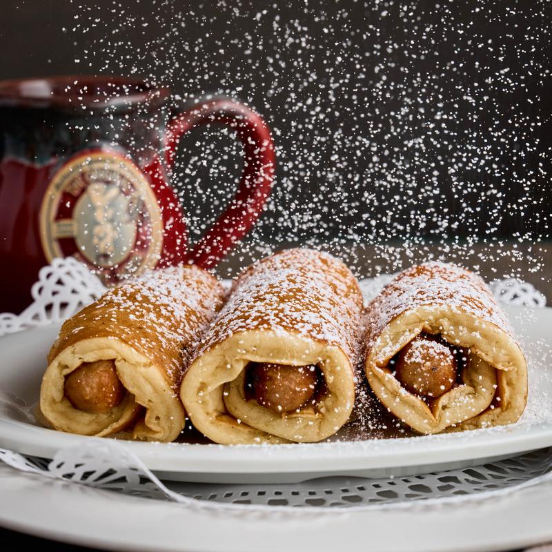 Our juicy pork links wrapped in buttermilk pancakes and lightly dusted with powdered sugar | 990 CAL