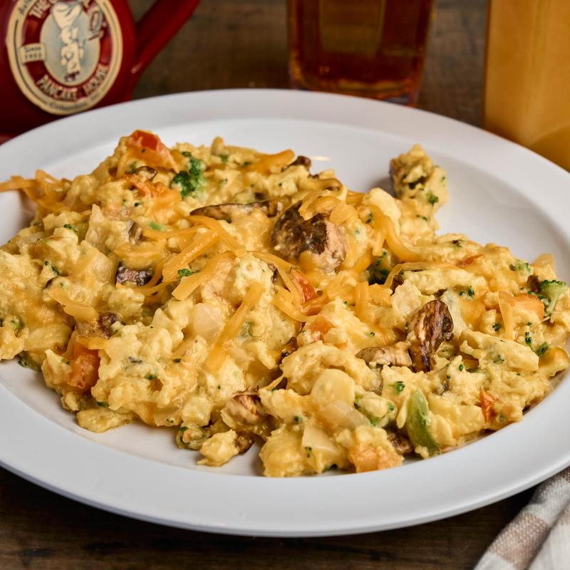 Classic combinations of our premium ingredients lightly scrambled with four large eggs and served with your choice of three buttermilk pancakes, grits or toast. Substitute fresh fruit +3.95. Substitute egg whites +2.75. Substitute home fries + 2.75.
