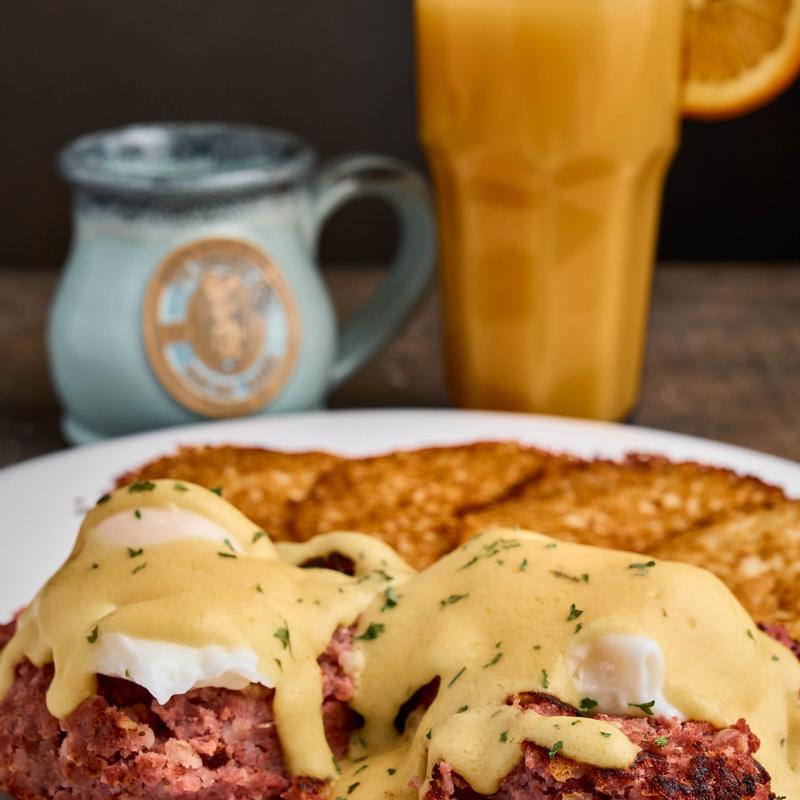 Our wonderful corned beef hash and poached eggs topped with hollandaise sauc | 1060-1110 CAL