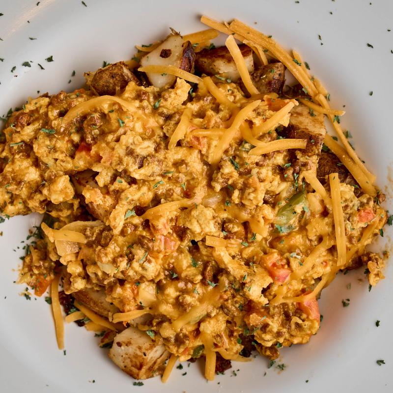 Home fries topped with two eggs*, chorizo, cheddar cheese, onions, tomatoes and green peppers | 1140-1170 CAL